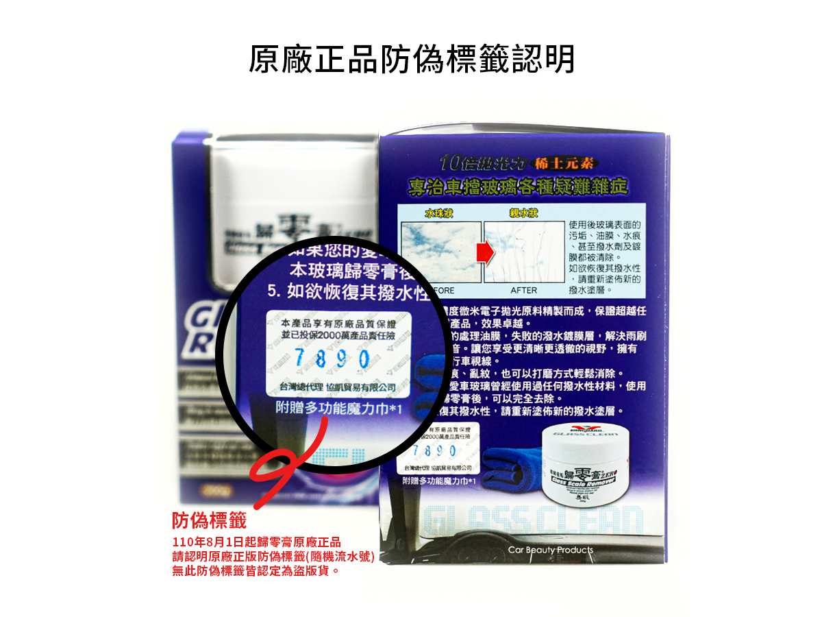 商品介紹‧高濃度微米電子拋光原料精製而成。‧保證超越任何同性質產品,效果卓越。‧專門處理失敗的潑水鍍膜層。‧能夠解決雨刷跳動及異音。‧工業污染、酸雨痕、礦物質凝結物、七彩油膜等。‧玻璃重垢附著物都能輕易去除。‧玻璃上的刮傷痕、亂紋,可用打磨方式消除。使用建議‧玻璃曾經使用過任何撥水性材料,使用本玻璃歸零膏後,會完全去除。‧如欲恢復其撥水性,請重新塗佈新的撥水塗層。‧想擁有水滴快速飛走的效果,建議使用撥水劑保養。使用方式1.先將玻璃表面泥沙灰塵洗淨。2.用擰乾微濕的纖維布擦拭或上蠟棉沾劑,以畫圓方式塗抹玻璃研磨除垢。3.能使用在汽車玻璃、浴室玻璃、櫥窗玻璃。4.如遇膏劑有硬化現象,可加適量清水調和。觀看影片>【玻璃去除油膜】規格說明‧品名:玻璃重垢歸零膏‧成分:微米稀土CeO2拋光料、乳化劑‧容量:200g‧附件:擦拭布x1(款式顏色隨機)‧產地:台灣KYOEI化學實驗室注意事項‧請在通風陰涼處使用。‧皮膚過敏者或長時間使用者請戴保護手套。‧不慎誤食不要催吐,並立即就醫。‧請避免兒童接觸,若不慎接觸到眼睛,請以大量清水沖洗並立即就醫。‧玻璃專用,請欲於非玻璃以外的材質表面。‧請勿於太陽直射或高溫的環境下操作。‧清除本產品效果,請使用玻璃專用研磨劑。‧因每台車況與個人使用劑量不同,呈現效果請依實際操作為主。‧歸零膏為膏狀清潔用品,運送過程搖晃易導至內容易物呈現不規則樣,此屬正常現象,不影響產品品質,可安心使用。收到後靜置一段時間,即可恢復表面平整。