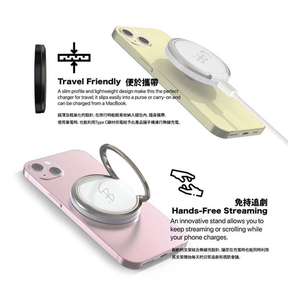 .免持追劇:支架結合無線充設計,讓您在充電時也能同時利用其支架開始每天的日常追劇和視訊會議