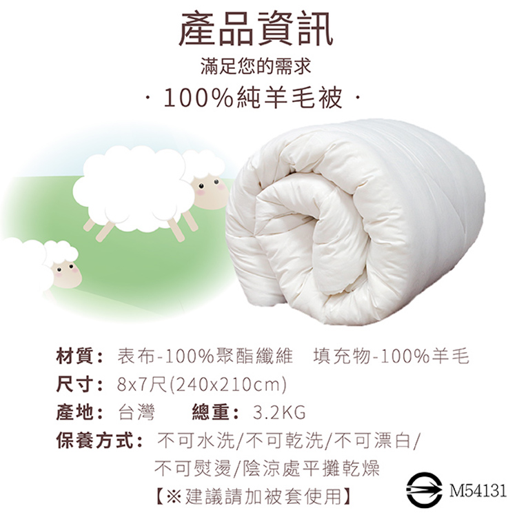 ★特色:【親膚性】天然羊毛含動物性蛋白質,與人體皮膚層蛋白質屬性相同,具有天然親膚性【衛生保暖】羊毛纖維柔軟彈性佳,天然的波浪形,捲曲蓬鬆感,擁有極佳的保暖性【吸濕排汗】吸濕、散熱、調節溫度等功能在重大纖維中,名列前茅,幫助人體散發汗液與多於體熱,保持乾爽舒適【彈性持久】羊毛的蛋白質纖維為螺旋狀組織,為天然彈簧,摺疊後可有效恢復彈性,蓬鬆舒適【防塵抗污】吸濕性強,不產生靜電,故灰塵污垢不易附著,保養便利★產地:台灣★內容件數與尺寸: 羊毛被X1件-8x7尺 (242x212cm)★保養說明 : 不可水洗╱不可乾洗╱不可漂白╱不可烘乾╱不可熨燙§建議外加布套使用§不可水洗以免被胎變形,最好交由專業洗衣店以乾洗處理§定期置於日光下曝曬,可去水氣並達到消毒之效果