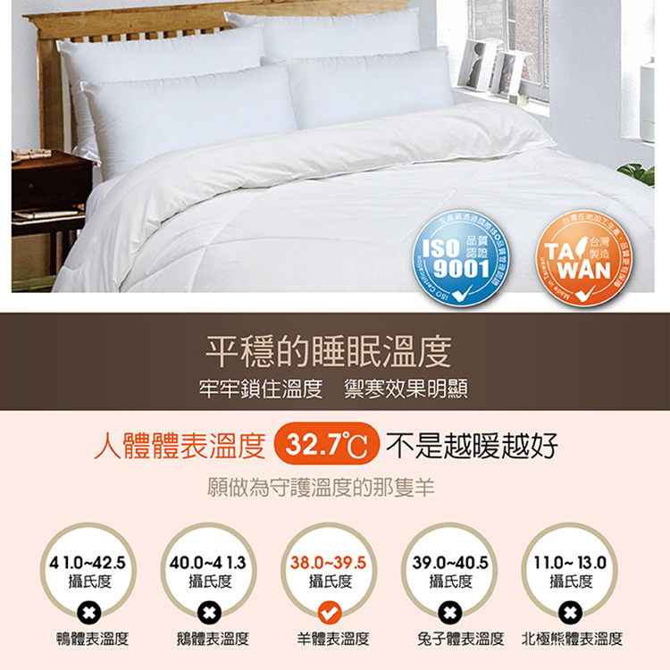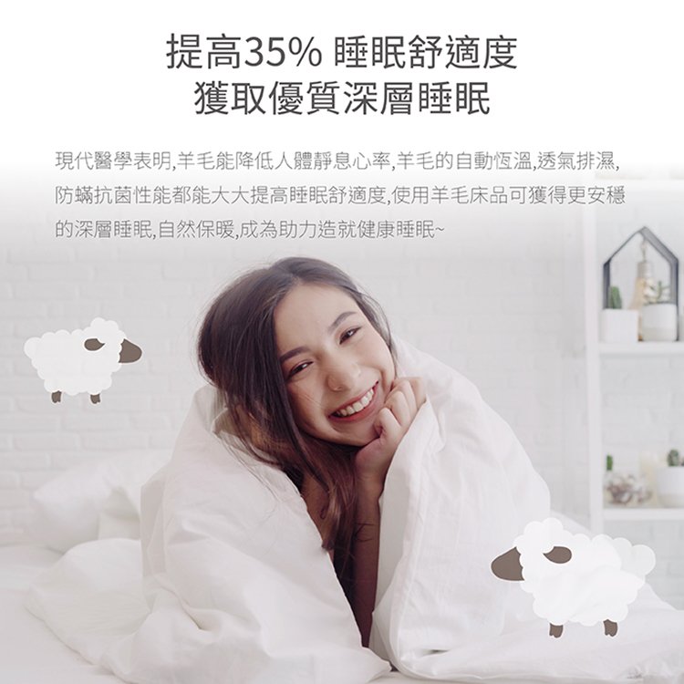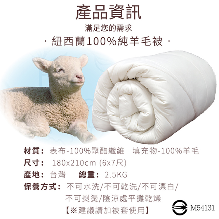 ★特色:【親膚性】天然羊毛含動物性蛋白質,與人體皮膚層蛋白質屬性相同,具有天然親膚性【衛生保暖】羊毛纖維柔軟彈性佳,天然的波浪形,捲曲蓬鬆感,擁有極佳的保暖性【吸濕排汗】吸濕、散熱、調節溫度等功能在重大纖維中,名列前茅,幫助人體散發汗液與多於體熱,保持乾爽舒適【彈性持久】羊毛的蛋白質纖維為螺旋狀組織,為天然彈簧,摺疊後可有效恢復彈性,蓬鬆舒適【防塵抗污】吸濕性強,不產生靜電,故灰塵污垢不易附著,保養便利★產地:台灣★內容件數與尺寸: 羊毛被X1件-6x7尺 (180x210cm)★保養說明 : 不可水洗╱不可乾洗╱不可漂白╱不可烘乾╱不可熨燙§建議外加布套使用§不可水洗以免被胎變形,最好交由專業洗衣店以乾洗處理§定期置於日光下曝曬,可去水氣並達到消毒之效果