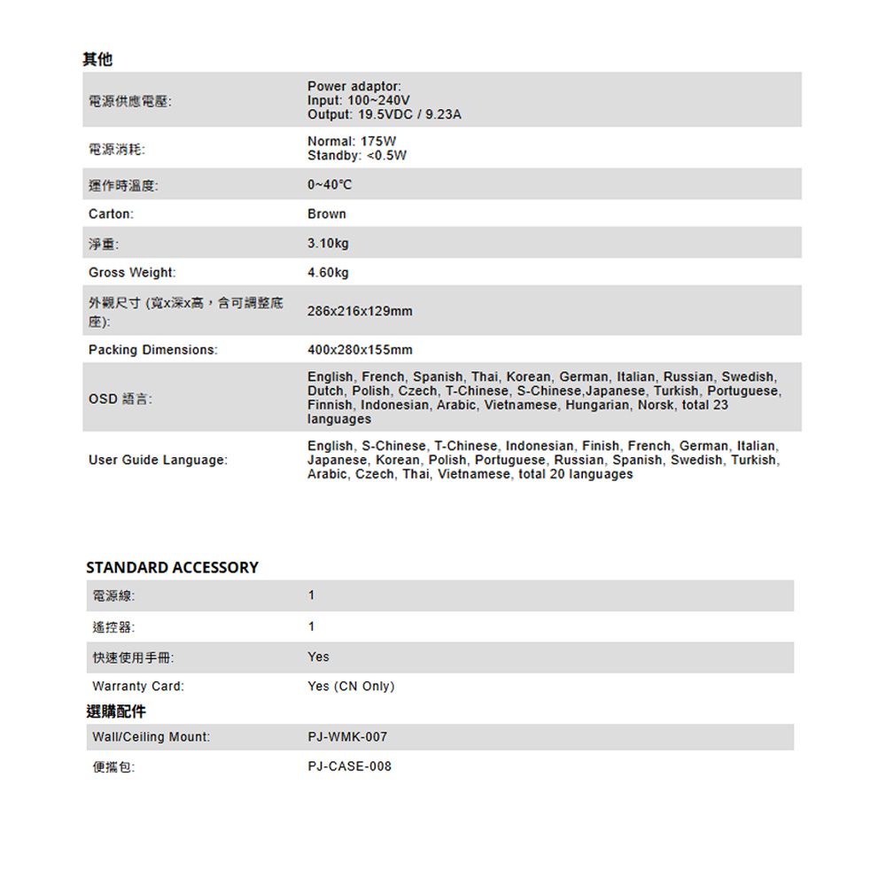 -淨重: 3.10kg ; Gross Weight: 4.60kg
