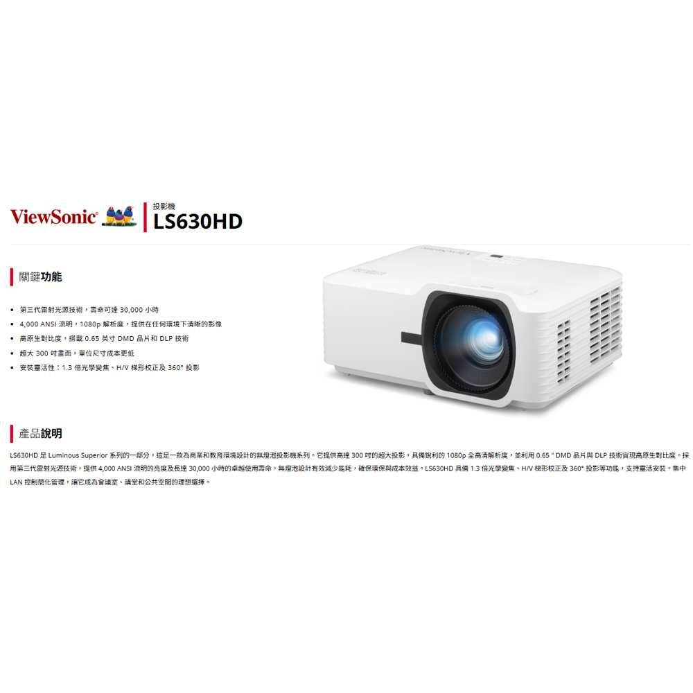 昌運監視器 ViewSonic LS630HD 4,000 ANSI 流明 1080p 雷射商業/教育投影機