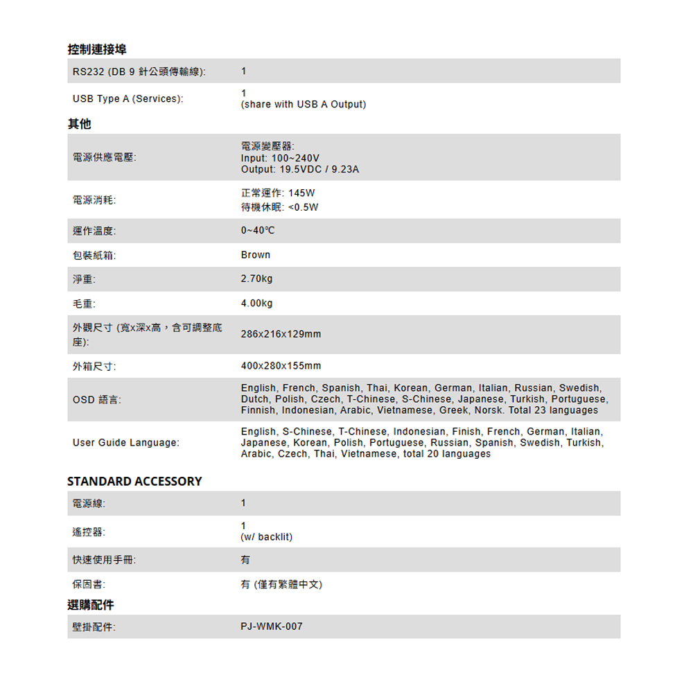 -外觀尺寸 (寬x深x高,含可調整底座): 286x216x129mm