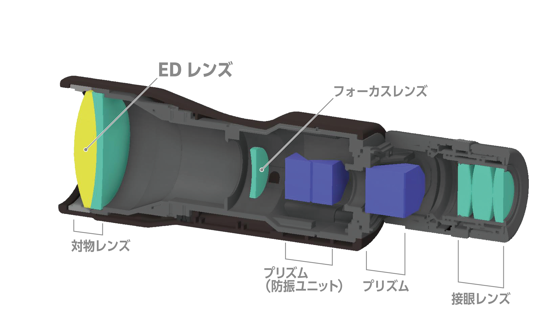 性能關鍵的物鏡採用ED玻璃(特殊低色散玻璃),呈現極為優異的光學性能。