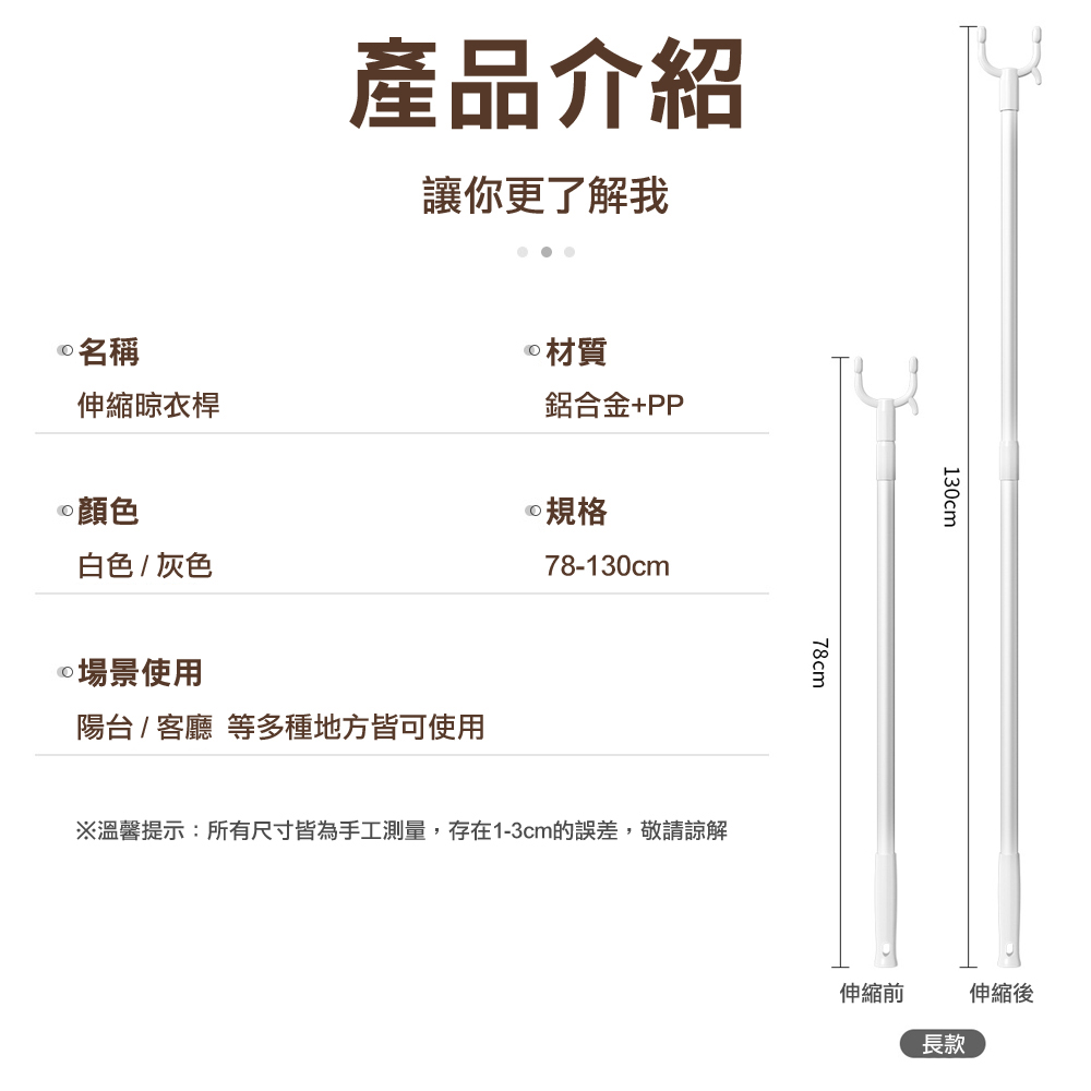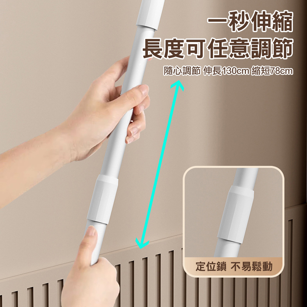 規格(尺寸):長度可伸縮:78-130cm材質:鋁合金+PP*注意事項*1.產品因拍攝或螢幕設定不同,可能與實品略有差異,請以實際商品為準。2.圖檔為情境示意圖,本商品內容不包含擺飾物品。3.七天鑑賞期非試用期,商品一經使用或組裝後,恕無法辦理退換貨。
