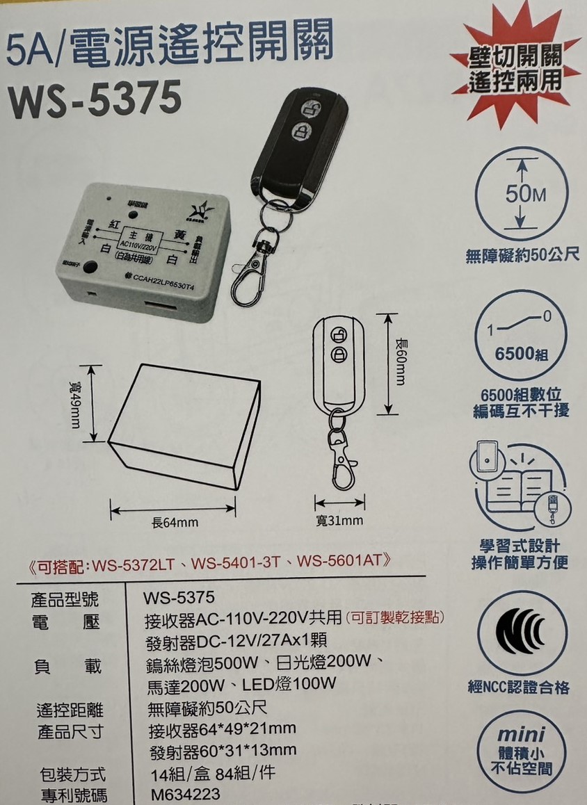 (感應王照明)【伍星】WS-5375 5A電源遙控開關【無障礙距離50公尺-可增設發射器-全電壓-台灣製造】