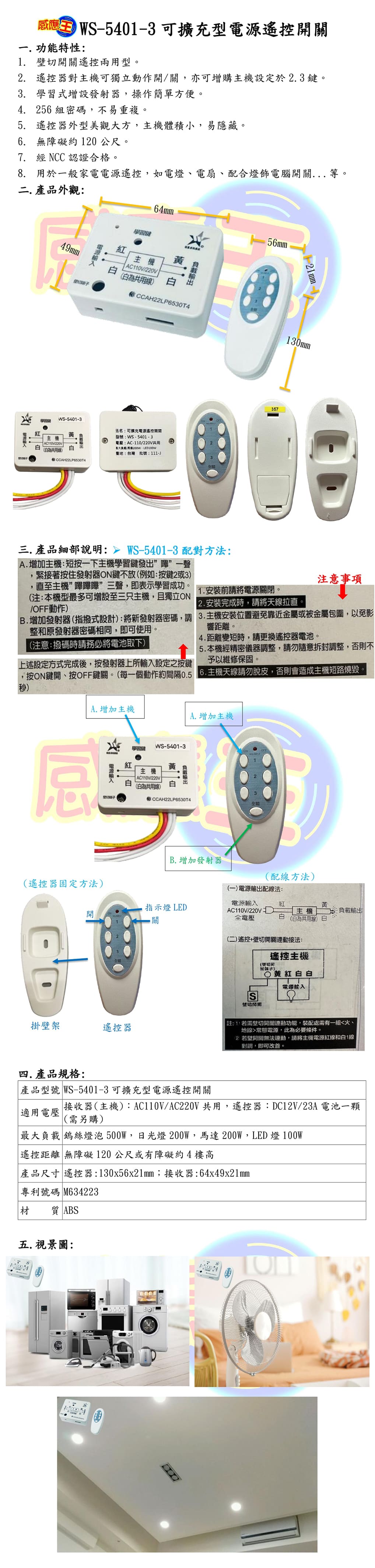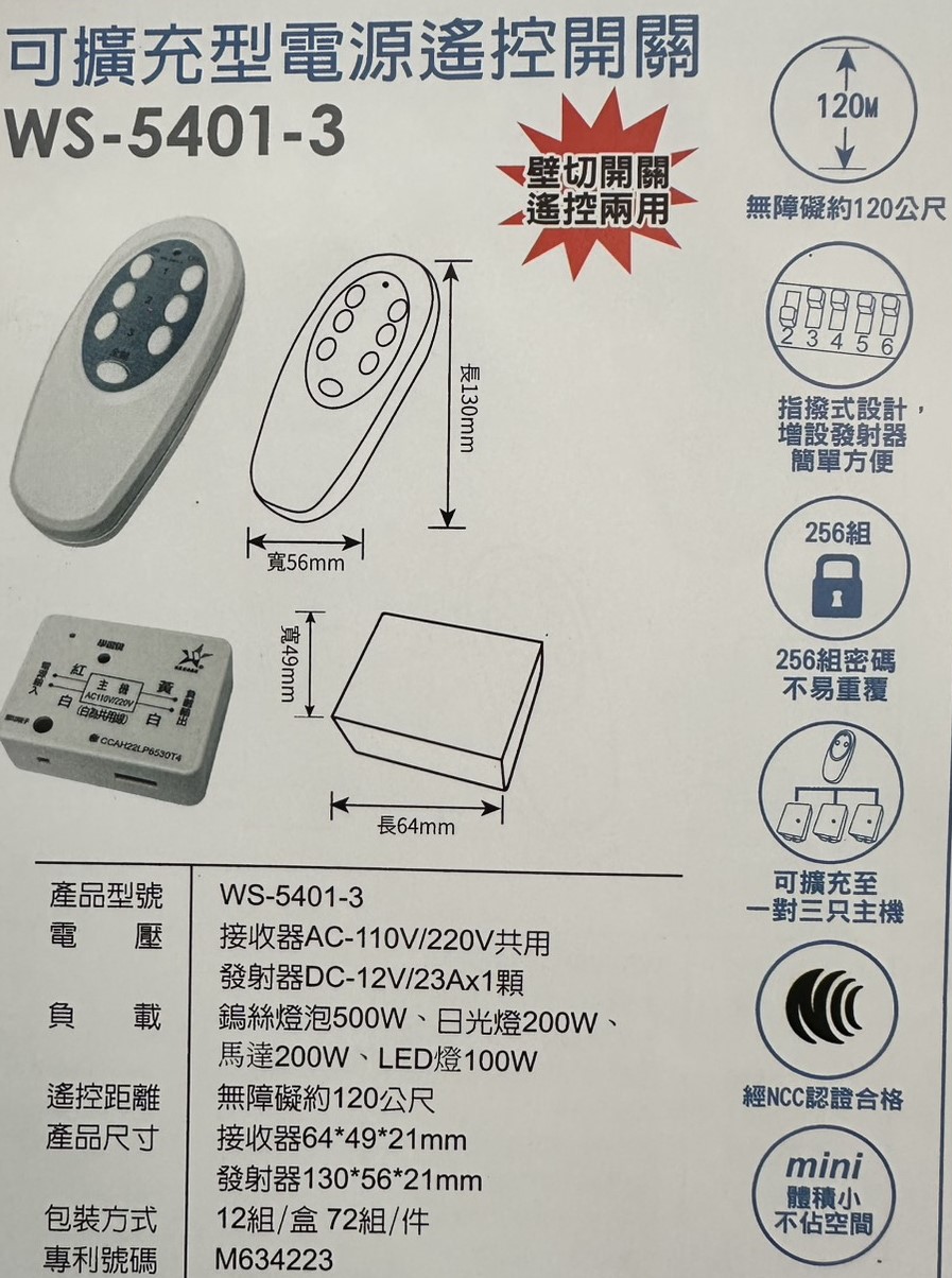(感應王照明)【伍星】WS-5401-3可擴充型電源遙控開關【遙控距離120公尺-可增設發射器-全電壓-台灣製造】