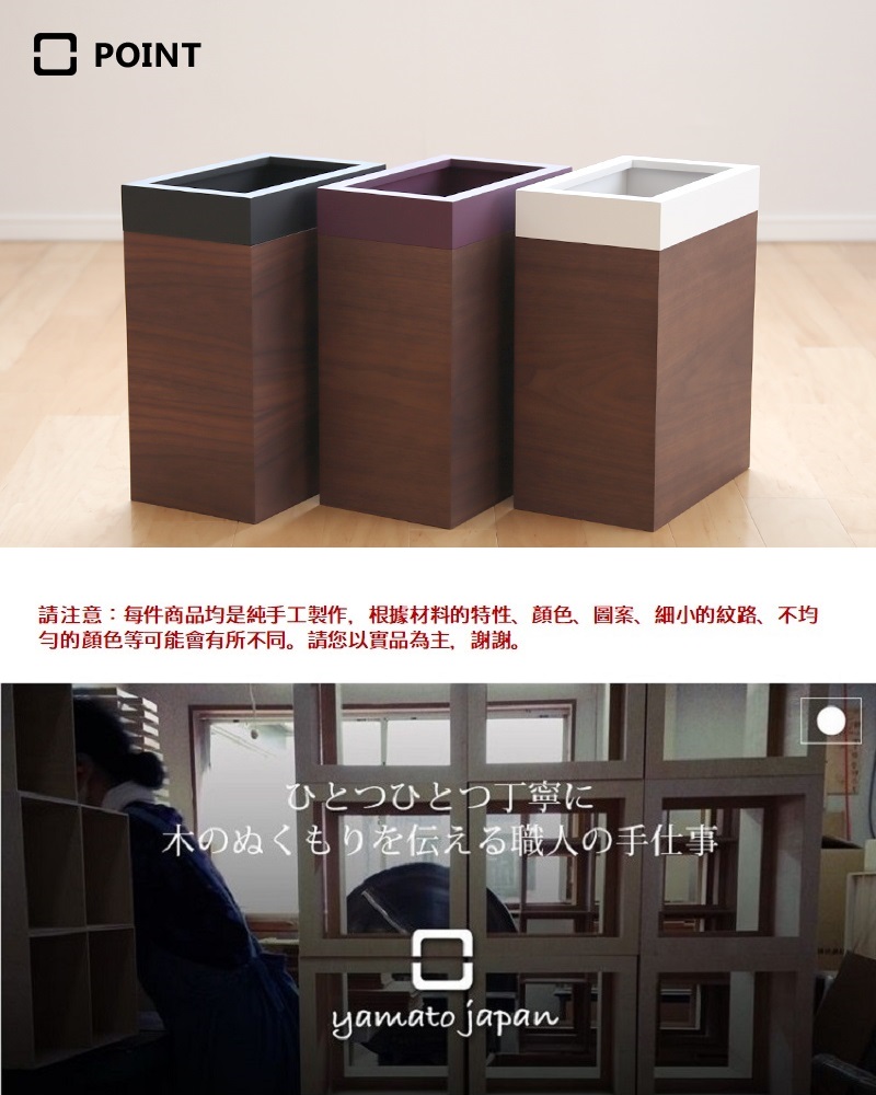 使用生長在潔淨的水和大自然中的木材每個木材都是精心挑選而出,木匠們用著傳統與現代的技術及純手工製作成許多與我們日常生活息息相關的周邊用品。每件商品都是獨一無二的。yamotojapan希望透過木製商品的柔和感與溫暖為顧客帶來更舒適的生活品質它是一款現代簡單而優雅的設計,非常適合您的房間,它的好無需過多的說明不僅適合放置在家裡的客廳,也可放在工作場所等官方場所天然木紋結合了時尚色彩,外觀看上去不像垃圾桶,反倒覺得是個室內裝飾品尺寸:約27 × 深16.5 × 高35 (cm)材料:天然木材■表面處理:聚氨酯漆面容量:約10L重量:1.72公斤原產國:日本請注意:每件商品均是純手工製作,根據材料的特性,顏色、圖案、細小的紋路、不均勻的顏色等可能會有所不同,但是所有產品均由製造商檢查後發貨,請您以實品為主,謝謝。