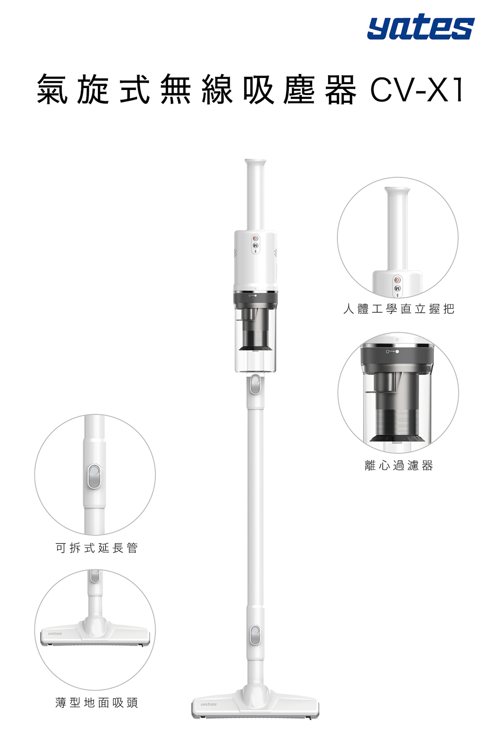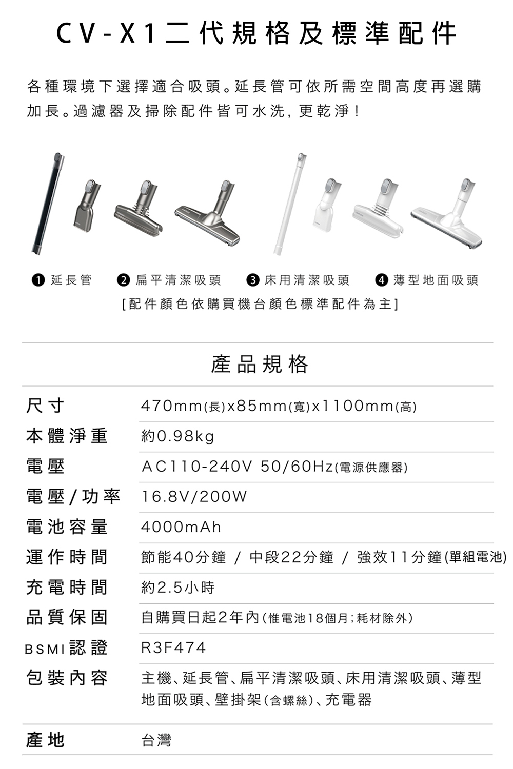 產品名稱:Yates CV-X1二代產品電壓:16.8V電池容量:4000mAh充電時間:約2.5小時使用時間 :節能/40分鐘;中段/22分鐘;強效/11分鐘(單組電池)重量:0.98kg(主機)功率:16.8V/200W產地:台灣BSMI認證:R3F474【商品內容物清單】內附:主機、延長管、扁口清潔吸頭、床用清潔吸頭、薄型地面吸頭、壁掛架(含螺絲)、充電器-----雙電池旗艦版贈送-----送濾芯*1、濾片*20片、毛刷吸頭*1、隙縫吸頭*1、伸縮軟管*1、電池組*1二代新上市加碼再送市價799小立架【五項產品保障,優質售後,絕對是品質保證】※Yates亞堤斯原廠,品牌在台已深耕8年,熱銷破萬台※產品為二年保固,電池18個月保固※產品零件皆在台灣生產,售後維修快速※保固注意:1.本產品切勿吸水、潮濕物品,會造成機內電路損壞,未安裝過濾棉就使用以致馬達毀損等人為疏失,不予保固,請注意!!2.請勿自行拆解以免造成危險,自行拆解即喪失您的保固權益,請留意。