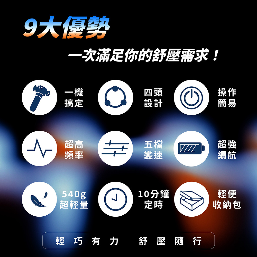 A:【魔導師全方位高頻槍】整合四種按摩頭於一機,無須替換按摩頭,精準又即時地掌握各部位的按摩需求。