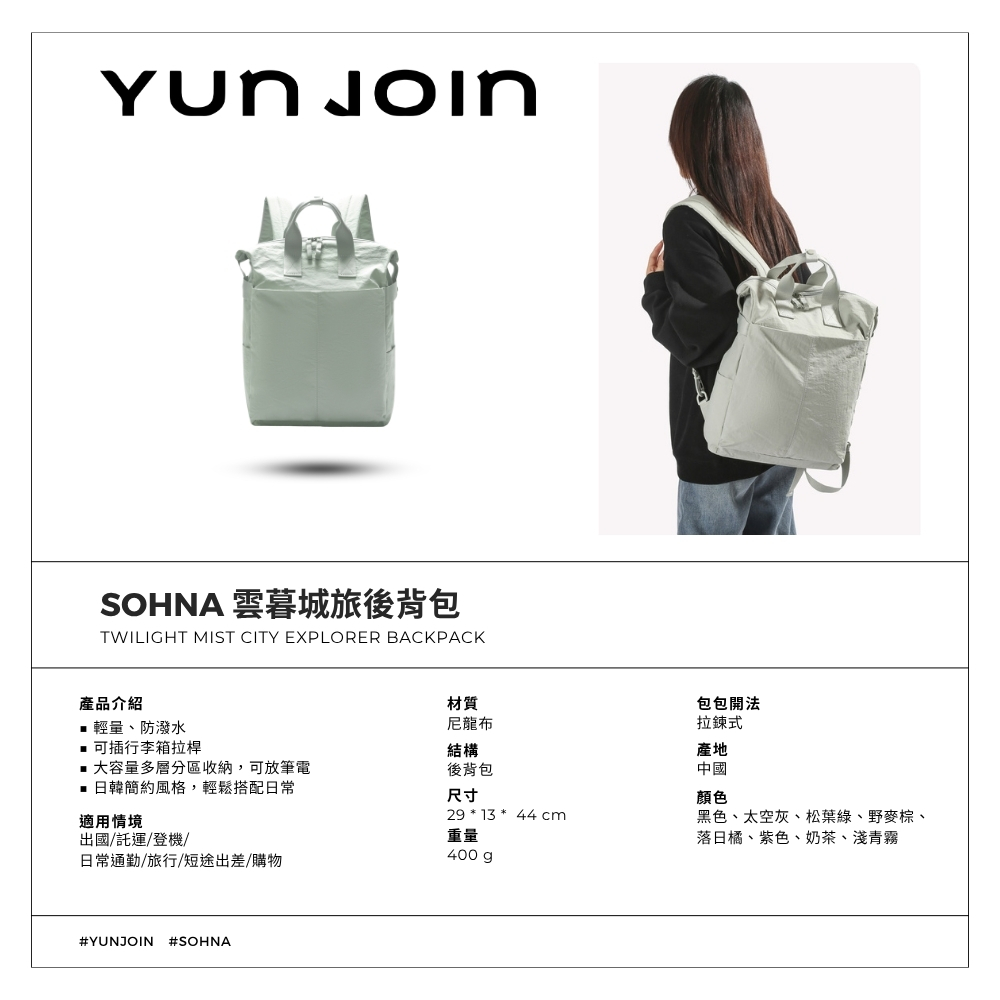 感謝各位蒞臨 YUNJOIN本賣場公司現貨供應且隨訂單由蝦皮代開立電子發票政府合法營業登記店家,安全品質有保障。【產品介紹】Sohna 系列 - 靈感源自日韓簡約風格,以柔和色調與親膚質感打造輕盈舒適的日常包款。選用塔絲絨面料,結合實用收納與極簡美學,無論是通勤、出遊還是日常穿搭,皆能輕鬆融入。Sohna 陪你溫柔行走於城市與生活之間✅可放 13~16 吋筆電✅可安插行李箱拉桿✅輕量設計僅 400g,日常背負無負擔✅防潑水塔絲絨尼龍布料,下雨天也不怕✅多層收納結構,分類有序不凌亂✅日韓簡約風格,輕鬆搭配日常【產品規格】材質:尼龍尺寸:29 * 13 * 44 cm容量:25 L重量:400 g結構:後背包顏色:黑色、太空灰、松葉綠、野麥棕、紫色、奶茶、橘紅、淺青霧*尺寸及顏色皆以實物為準※尺寸為手工測量,會因布料彈性、測量起點等因素略有誤差,誤差尺寸±2cm為國際驗貨標準可接受範圍。※商品圖檔顏色因電腦螢幕設定及攝影光線會有所不同,以實際商品顏色為準。#拉桿袋 #旅行袋 #拉桿包 #旅行包 #拉桿行李袋 #旅行收納包 #收納袋 #環保袋 #收納包 #防潑水包 #防塵包#旅行 #出遊 #收納 #防潑水 #耐用 #質感 #旅遊必備#後疫情 #夏季 #國內旅遊 #安心國旅──────────────────────────────────────────────────────────────────【客服】線上快速諮詢有問題歡迎詢問,專人在線為您服務。若有任何問題或是收到商品時發現異常,可拍照片傳至聊聊客服人員上班時間會馬上為您處理。服務時間:週一至週五09:00~18:00